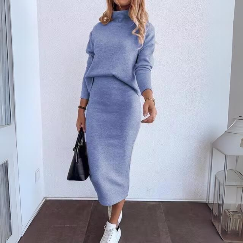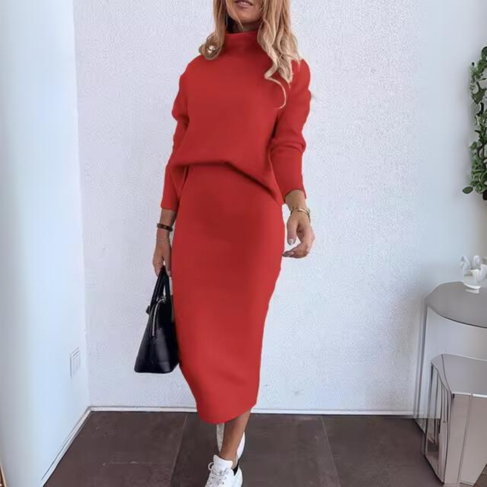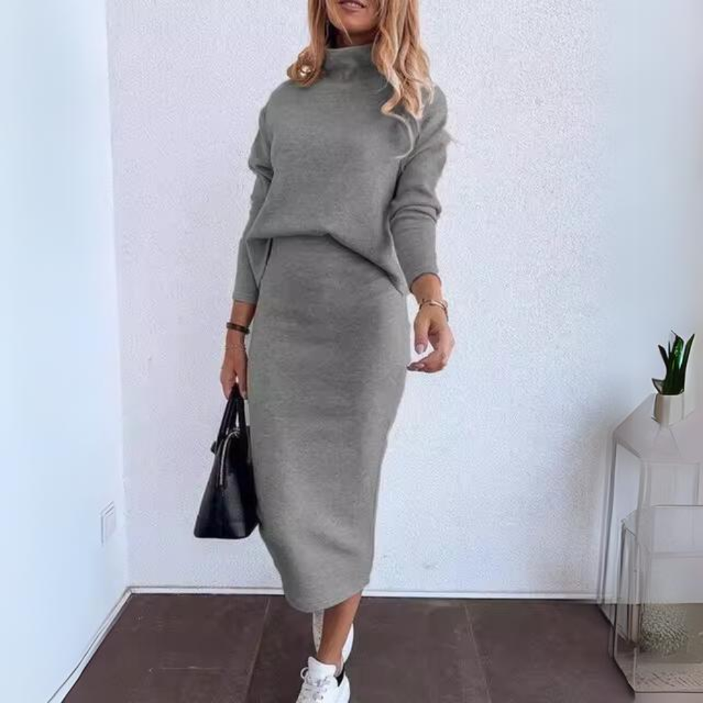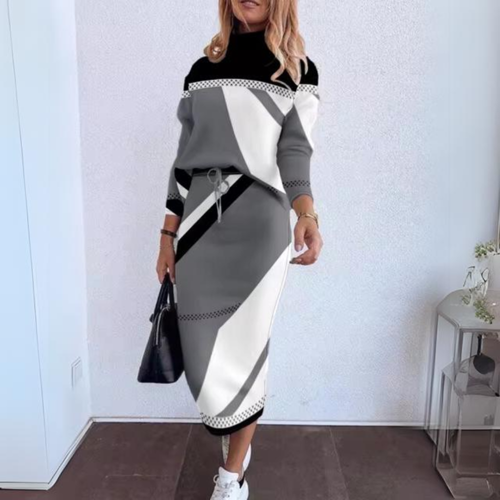 Dieses elegante zweiteilige Set kombiniert einen stilvollen Rollkragenpullover mit einem raffinierten Bleistiftrock, perfekt für die modebewusste Frau. Hergestellt aus weichen, natürlichen und zarten Materialien, bietet dieses Outfit die perfekte Balance zwischen Komfort und Klasse. Die langen Ärmel und das subtile Druckdesign verleihen einen Hauch von Raffinesse, ideal für formelle Anlässe oder einen schicken Tagesausflug