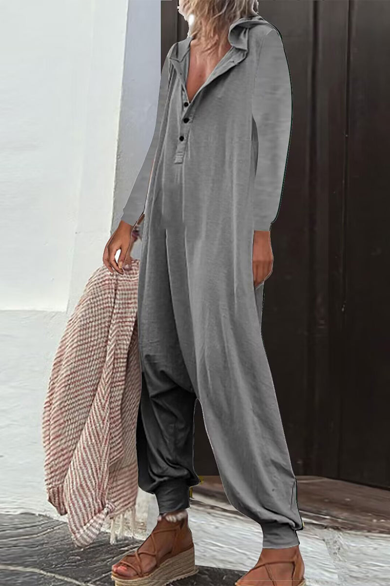 Casual Solid Buttons Hooded Collar Loose Jumpsuits (8 Farben)