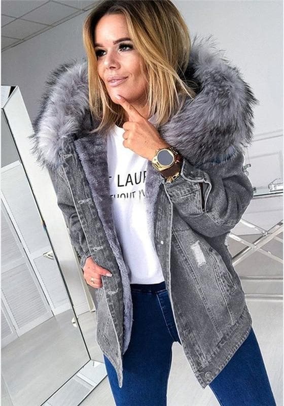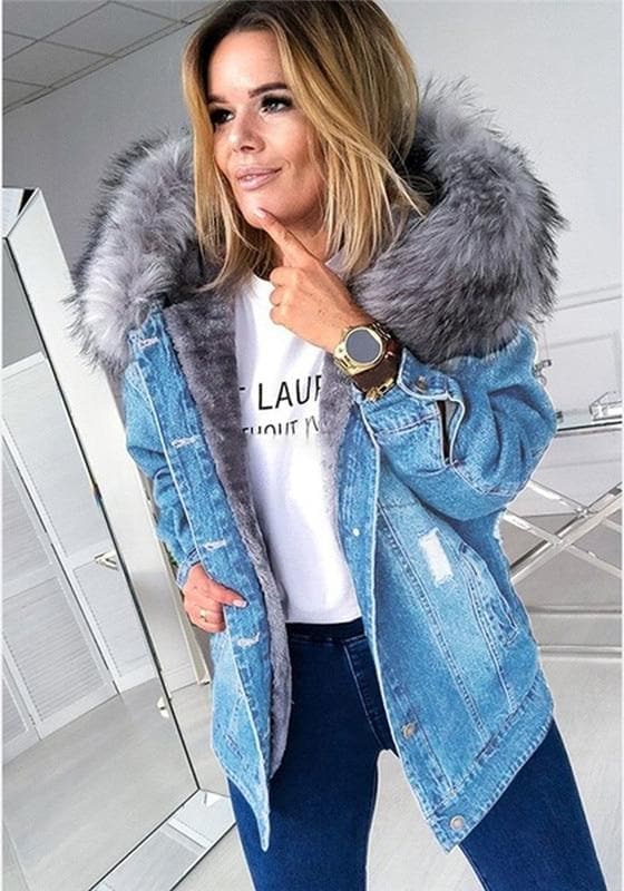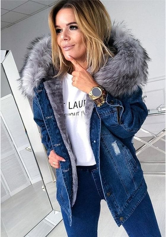 Monika - Modische lange Jeansjacke mit Kunstpelzkragen